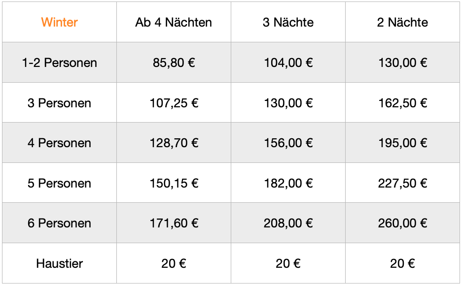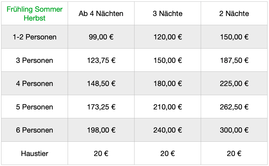 Alle Preise verstehen sich pro Übernachtung und inklusive gesetzlicher Mehrwertsteuer. Bettwäsche, Bade- und Handtücher, die Endreinigung, sowie sämtlicher Nebenkosten sind bereits im Preis enthalten.